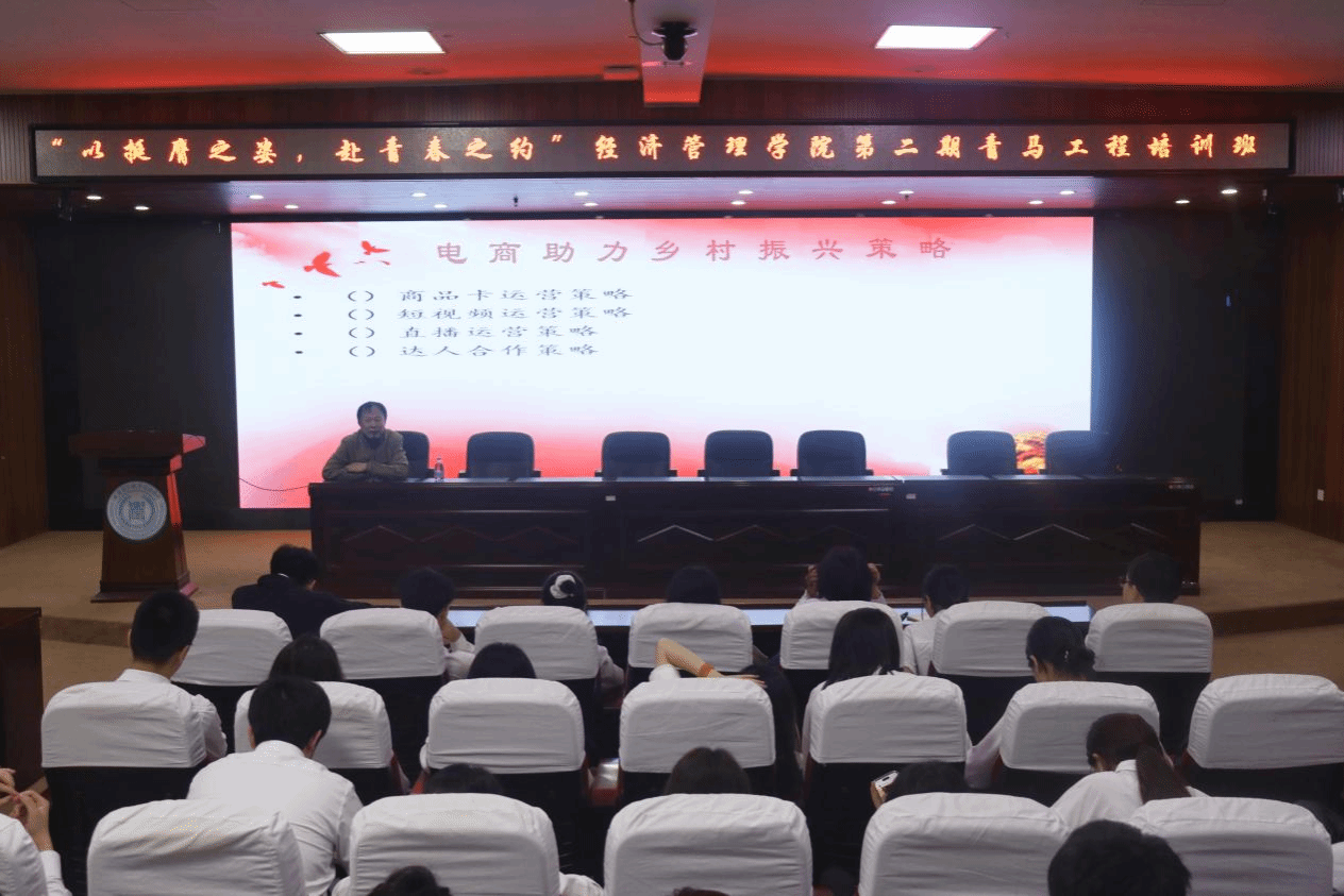 为提高学生干部的职业技能和就业创业能力,助力乡村振兴战略,2024年6月5日,经济管理学院副院长马风棋老师为青马学员开展了主题为“提高电商技能,助力乡村振兴”的培训课。