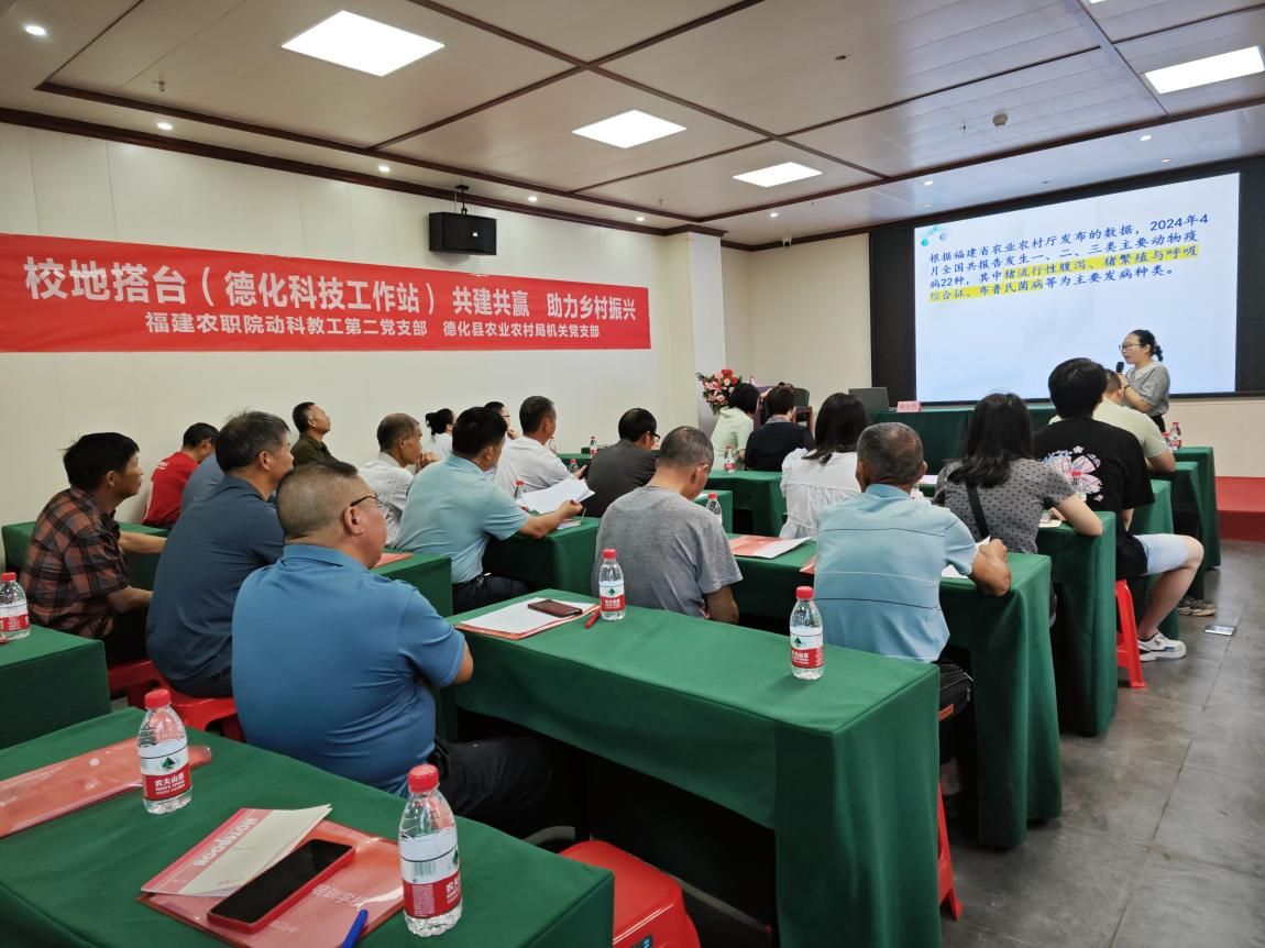 2024年8月22日-2024年8月23日,以和德化农业农村局机关党支部共同搭建的德化科技工作站为平台,动科教工支部动科兽医教研室支部书记林雪玲、支委赖宝色、党员教师谢开春、党员教师潘书磊及群众教师张佳博士,为泉州市德化县农业农村局举办的德化县“健康德化、防检先行”动物疫病防控技术培训班授课,党建与业务深度融合,发挥教工第二党支部的战斗堡垒及凝聚发挥群众作用,践行党员教师为农村基层服务宗旨,助力乡村振兴。