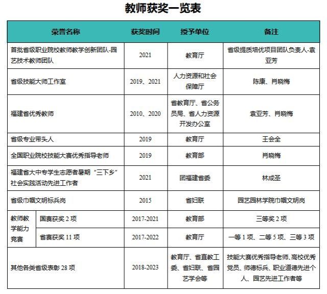 五年来,园艺园林学院充分贯彻立德树人的根本任务,着力培养学生的实践能力和综合素质。毕业生平均就业率达96.5%,有3人获得“中国大学生自强之星”称号,1人获得“福建省技术能手”称号,136人次获国家级奖学金。2021年荣获全国大中专学生志愿者暑期文化科技卫生“三下乡”社会实践优秀团队。学生踊跃参加各项技能竞赛,先后获得世界技能大赛福建选拔赛金奖1项;技能大赛国赛一等奖1项、二等奖1项、三等奖2项,省赛一等奖13项、二等奖17项。