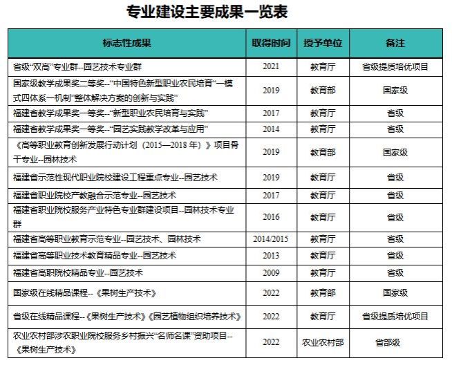 园艺园林学院落实习近平总书记关于教育的重要论述精神,一直致力于专业建设内涵提升。2021年,园艺园林学院省级“双高”专业群--园艺技术专业群获得立项。现有国家级骨干专业1个(园林专业)、省级示范专业2个(园艺、园林专业)、省级精品专业1个(园艺专业)、省级职业院校产教融合示范专业1个(园艺技术)、省级职业院校服务产业特色专业群建设项目1项(园林技术专业群)。荣获国家级教学成果二等奖1项、省级教学成果一等奖2项。国家级在线精品课程1门,省级在线精品课程2门,农业农村部涉农职业院校服务乡村振兴“名师名课”资助项目1个。