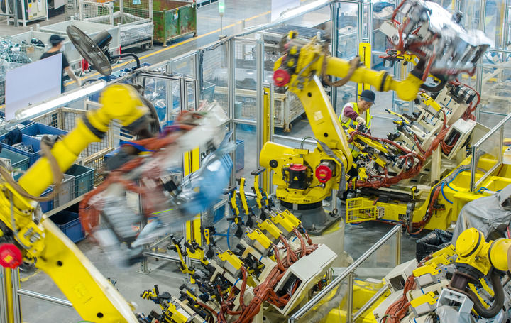 2025年10月9日,浙江省湖州市长兴经济技术开发区的长兴地通汽车部件有限公司技术人员操控工业机器人生产新能源汽车配件(无人机照片)。