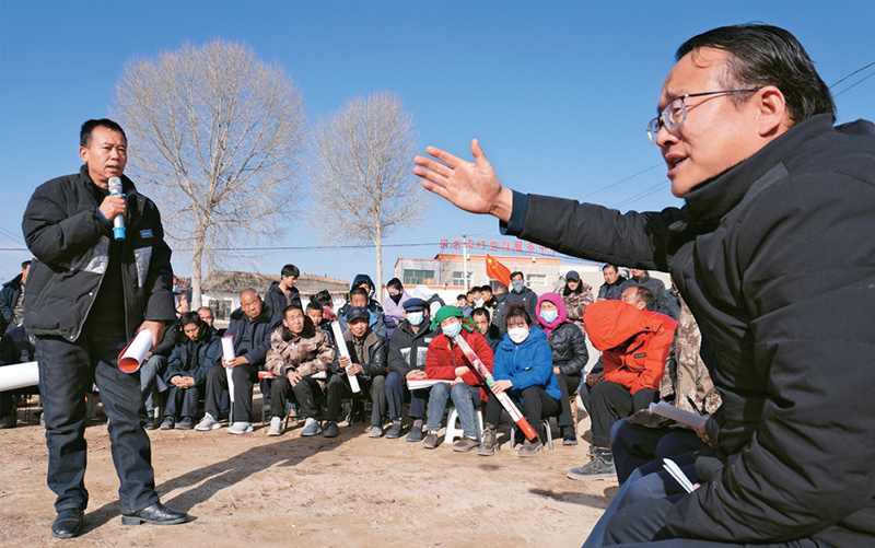 基层民主是全过程人民民主的重要体现。图为2024年1月17日,在甘肃省临夏州积石山县石塬镇宋家沟村灾后重建协商会上,乡镇干部、村干部与村民共同商议灾后重建相关事宜。