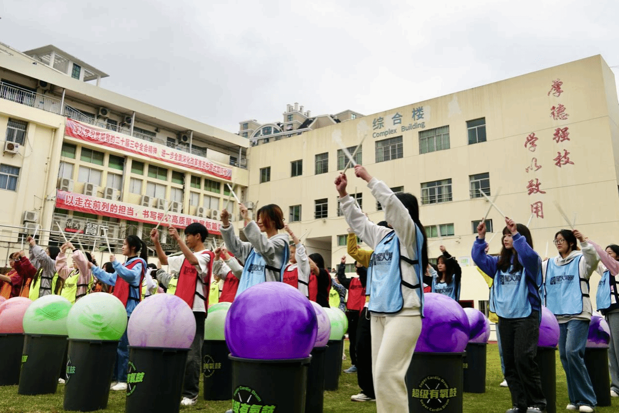 在“律动有氧鼓”“圣塔”“彩虹五子棋”“疯狂毛毛虫”等活动环节中,同学们相互进行头脑风暴,积极出谋划策,在一次次的沟通与协作中,每支队伍都表现出步调一致、齐心协力的良好氛围。尤其在“律动有氧鼓”环节,教练将有氧鼓与音乐节奏相结合,通过跳跃、舞动、伸展等动作释放身心,促进同学们全身心投入到激情四溢的音乐运动之中。同学们在教练的引领下以团队形式进行鼓舞创编,各队伍间思维碰撞,充分激发同学们的创新创造力。