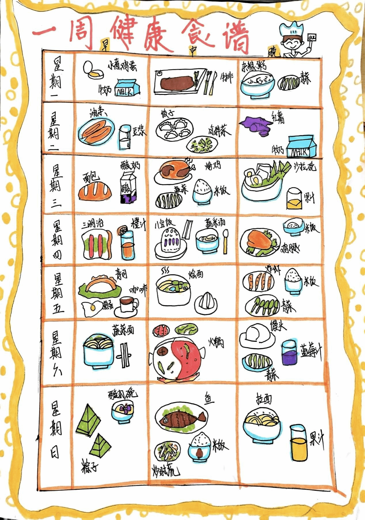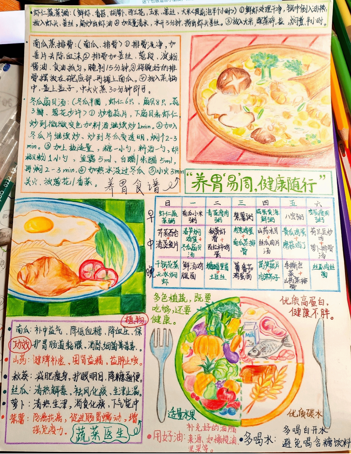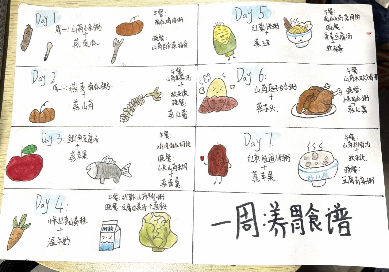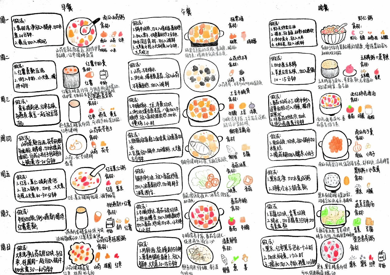 活动参与者们用画笔将他们对健康饮食的理解与创意融入到手绘食谱中。投稿的彩绘食谱皆色彩斑斓、图案精致,也体现出同学们对养胃食材的精心挑选和对健康饮食搭配的深思熟虑。经过层层筛选,最终评选出19份优秀作品进行网络投票。