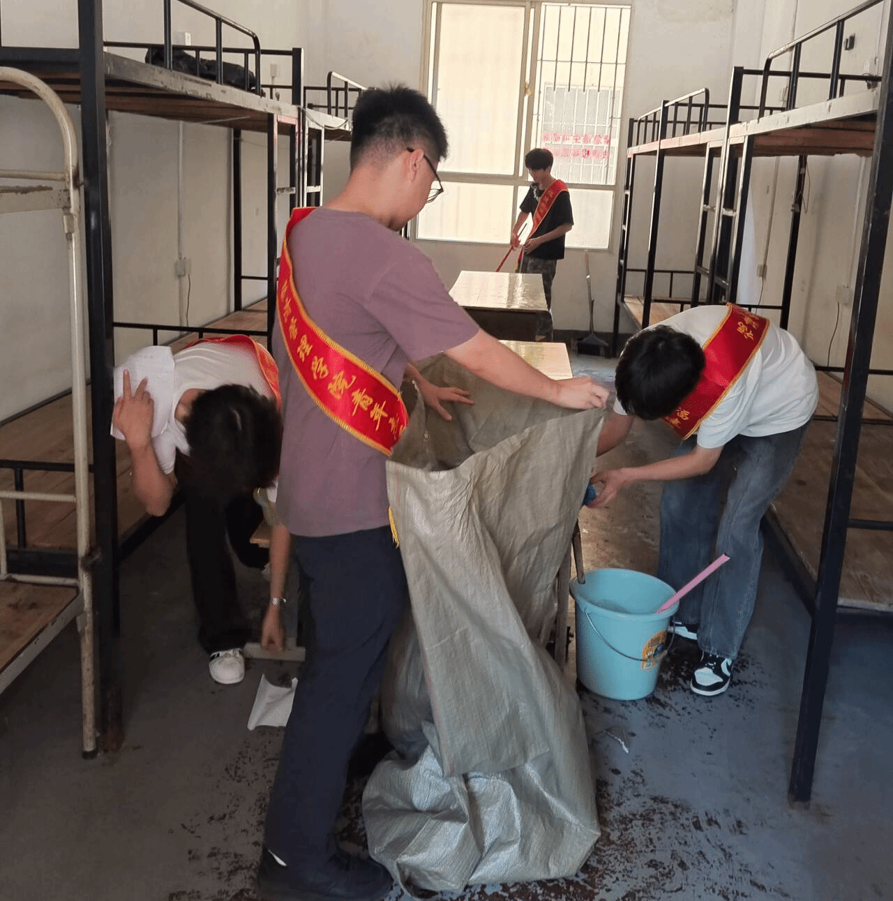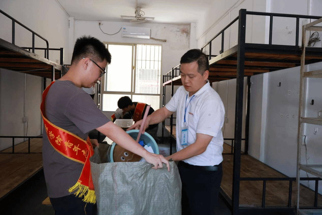 学生党员们热情高涨,分工明确,成立“物资整理组”“卫生清洁组”二个小组。物资整理组深入学生宿舍,协助23级即将离校实习同学分类整理衣物、书籍等物品,细心打包易碎品,对仍具使用价值的书籍、生活用品等进行登记整理;对需丢弃的杂物进行集中打包,确保物品处置规范有序。卫生清洁组手持扫把、拖把等工具,对已全部离校学生宿舍地面、桌面、窗台等区域进行彻底清扫确保床底无杂物、窗台无灰尘,打造干净卫生的文明宿舍环境。