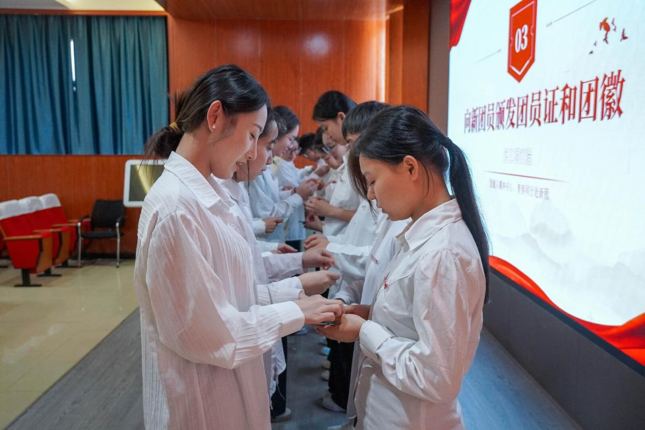 入团仪式在庄严的国歌声中拉开帷幕。主持人宣读新团员名单,由党员老师与优秀团员代表为新团员颁发团员证并佩戴团徽。