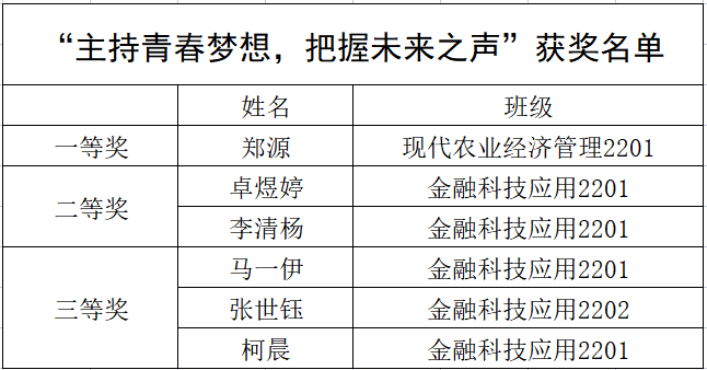 2023年3月16日,经济管理学院在学生活动中心举办“主持青春梦想,把握未来之声”主持人大赛。经济管理学院党政办负责人张琳娜老师、经济管理学院学工办负责人郑琳老师、经济管理学院学生党支部书记吴彩霞老师、学工部心理中心钟建老师,辅导员林雯倩、吴智雄、陈瑾、蔡婷婷老师担任此次比赛评委。比赛由黄柠柠、王靖文同学主持。