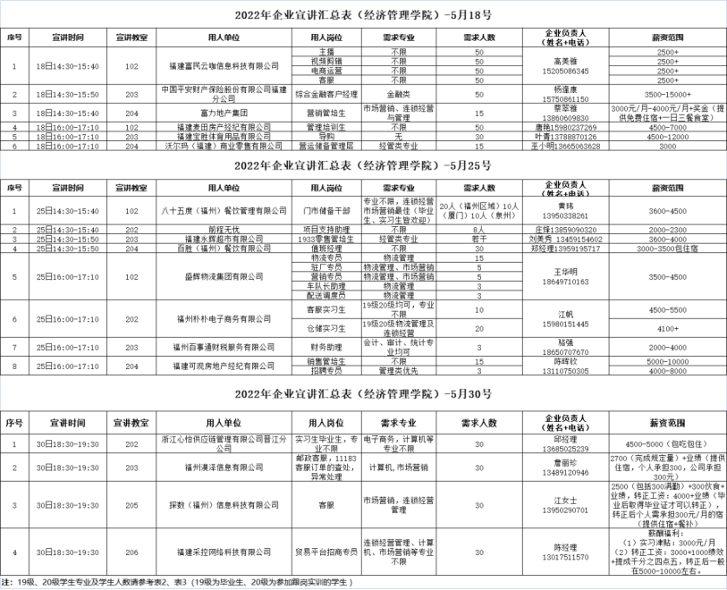 2022年经济管理学院20级学生跟岗实训校企合作专题宣讲安排表