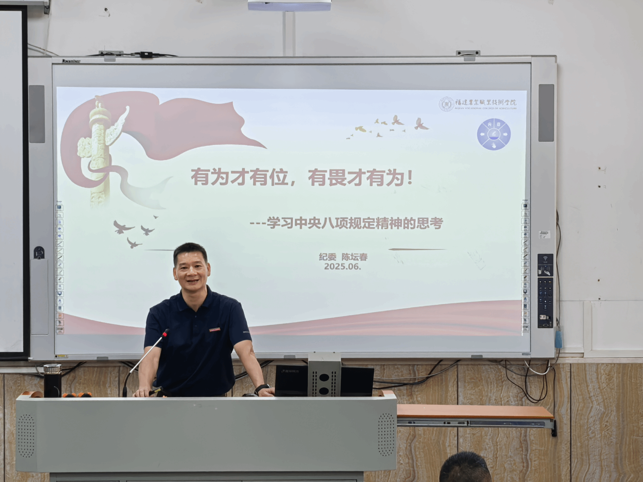 6月11日下午,院党委委员、纪委书记陈坛春以“有为才有位,有畏才有为”为题,为纪委办、人事处、后勤处、财务处、招标办等重点岗位人群、年轻干部、信息工程学院学生第二党支部作深入贯彻中央八项规定精神学习教育专题党课。