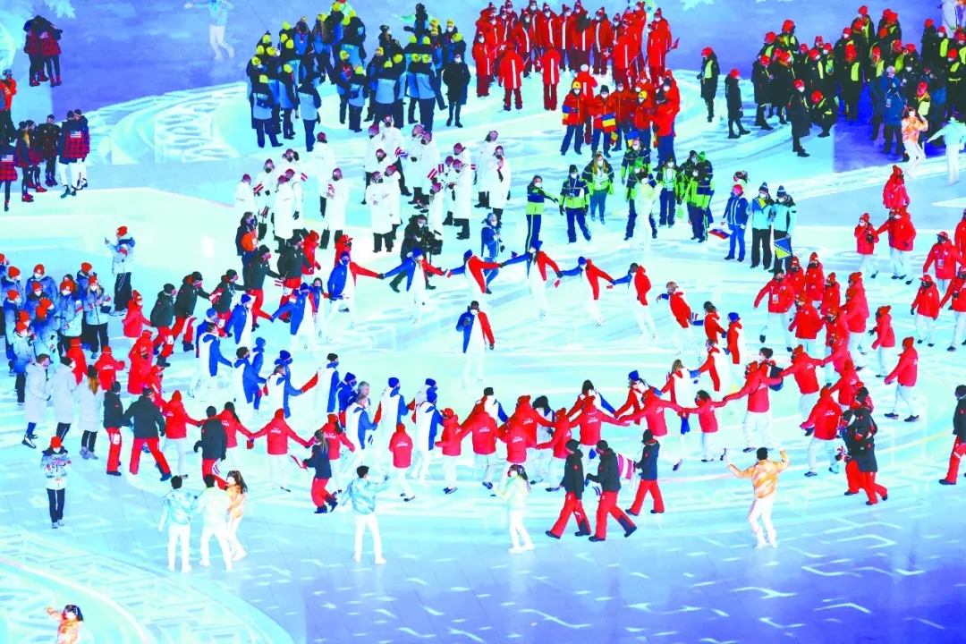 冬奥会开幕式上,一朵雪花的故事成为最温暖的伏笔。运动员入场式后,引导员举着写有参赛国家和地区名字的“小雪花”引导牌,汇聚在冰雪五环下,组成了一朵硕大的雪花,象征全世界人民紧密团结在一起。在闭幕式运动员入场环节,现场天上地下都由巨大的中国结线条包裹,最后的焰火表演环节,“天下一家”和“ONE WORLD ONE FAMILY”中英文字样的巨型烟花在“鸟巢”上空绚烂绽放。