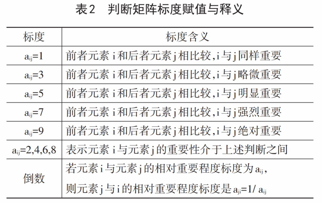 对于指标中同时涉及教育质量和经济价值产生的复杂元素,需运用两两比较多次确定,以判断其重要性,指标的重要性由专家评分呈现。本研究先设计专家评分表,邀请专家对每一层次的因素互相比较并打分,运用1—9比例标度对两两比较的因素打分,将相互比较的因素设为i和j(表2)。其次,合并专家矩阵,使用几何平均法得到判断集成矩阵。