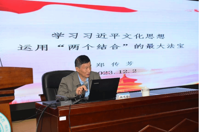 在专家讲座环节,郑传芳教授作了题为《学习习近平文化思想,运用“两个结合”的最大法宝》的专题报告,围绕习近平文化思想的重大意义、丰富内涵等进行诠释解读。郑教授表示,习近平文化思想的提出和系统阐述,在党的理论创新进程中具有重大意义,在党的宣传思想文化事业发展史上具有里程碑意义,为做好新时代新征程宣传思想文化工作、担负起新的文化使命提供了强大思想武器和科学行动指南。