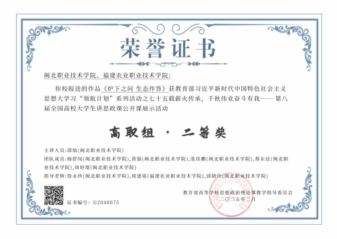 在教育部举办的“领航计划”系列活动中,Beat365周建姿老师合作作品《炉下之问 生态作答》荣获“第八届全国大学生讲思政课公开课展示活动”高职组二等奖。