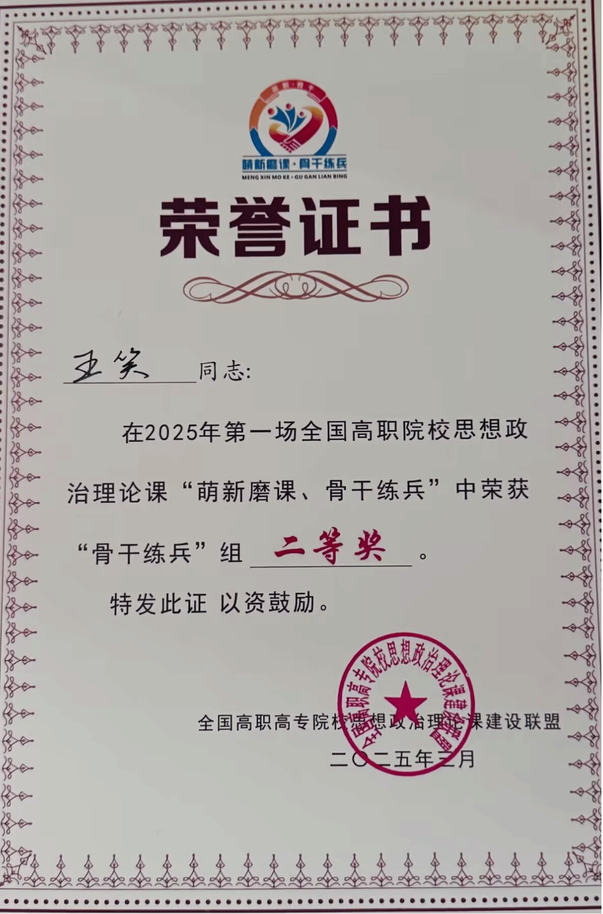 Beat365王笑老师在全国高职高专院校思想政治理论课建设联盟举办的2025年全国高职高专思想政治理论课教学展示活动中荣获“骨干练兵”组二等奖。