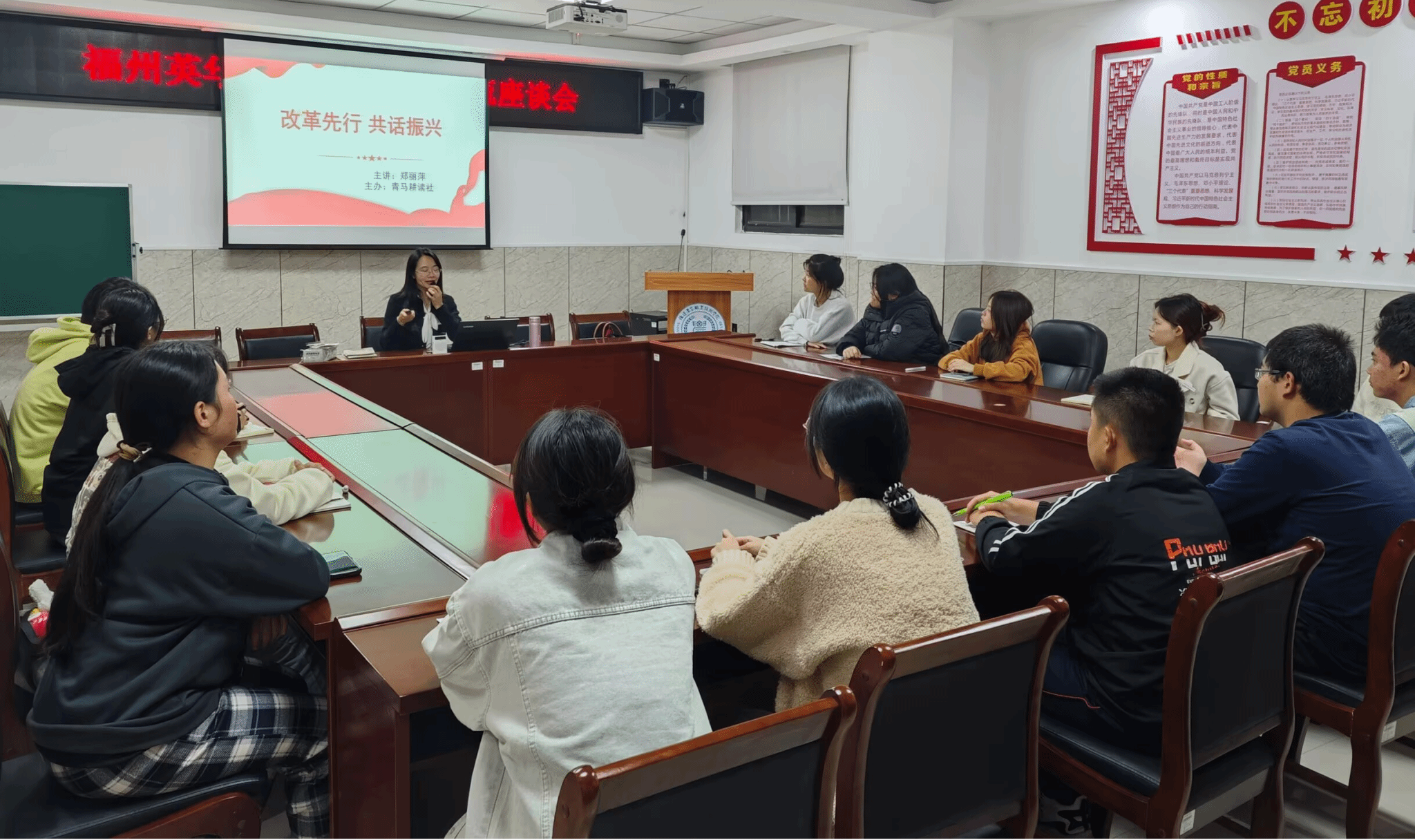 12月5日,马克思主义学院组织青马耕读社的同学们在闽台楼501开展“改革先行·共话振兴”学习贯彻党的二十届三中全会精神主题宣讲培训活动。培训会由青马耕读社指导老师郑丽萍主持。