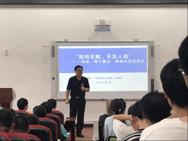 为深入学习贯彻习近平新时代中国特色社会主义思想,加强对大学生的思想政治引领,帮助学生扣好人生第一粒扣子。9月1日下午,马克思主义学院院长江明辉在生物楼212以《“我将无我,不负人民”——谈谈“两个确立”具有决定性意义》为题,为动物科技学院同学讲授一堂精彩的“开学第一课”。
