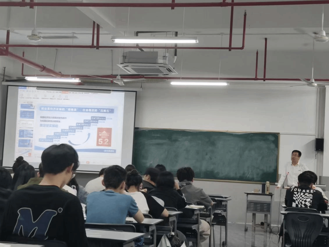 5月20日下午,校党委书记杨振坦走进“形势与政策”课课堂,在禾下503教室为信息工程学院2022级学生讲授“当前就业形势与实施就业优先战略”专题课。