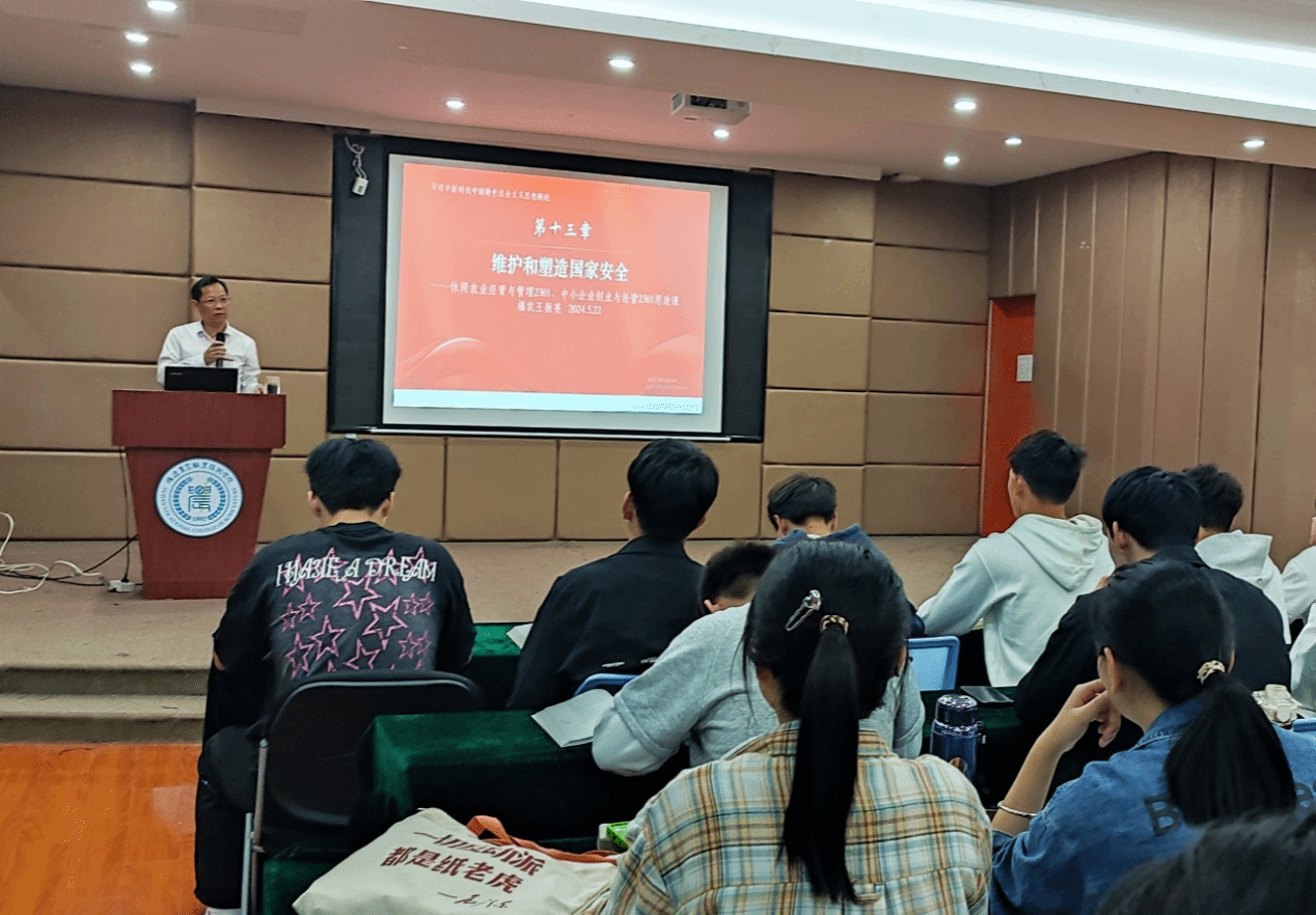5月22日上午,学院党委副书记王振亮以“维护和塑造国家安全”为主题,在创业大讲堂为乡村旅游产业学院2023级的学生讲授了一堂精彩的思政课。