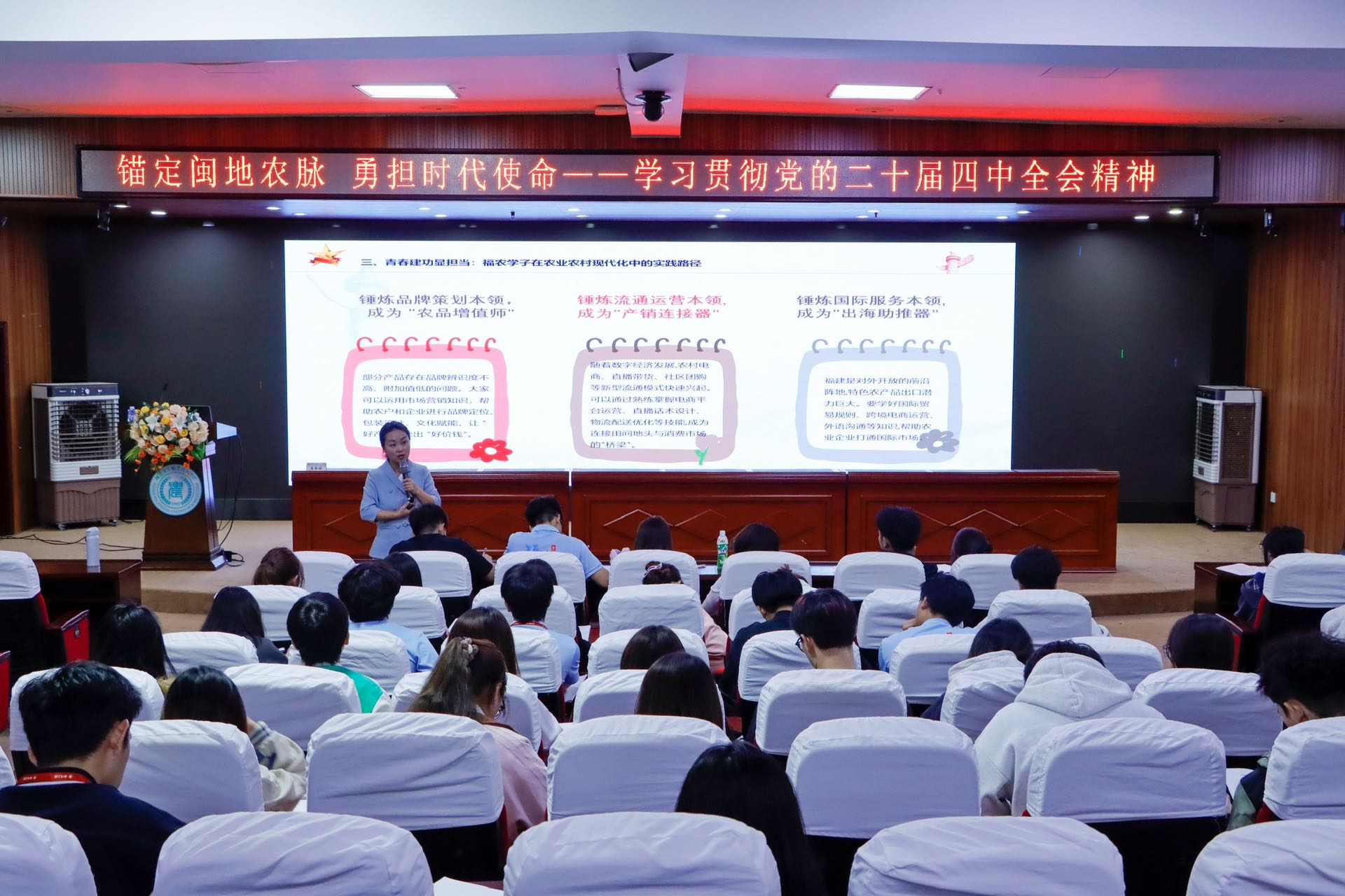 宣讲以“党的二十届四中全会精神”为切入点,向同学们介绍了全会概况,重点解读了会议关于“十五五”时期经济社会发展的战略部署,结合我校农类院校的特点,着重强调了农业农村现代化的重要地位。同时,聚焦福建特色农业实践,通过茶叶、畜牧、水产三大代表性产业的发展案例,生动展现了福建“特色化、规模化、品牌化、科技化”的农业现代化发展之路,让同学们真切感受到家乡农业产业的蓬勃发展活力。此次宣讲从政策解读到地方实践、青春行动等方面层层递进,为青年学子搭建起理论与实践对接的桥梁,助力青年学子找准在农业农村现代化中的人生坐标。