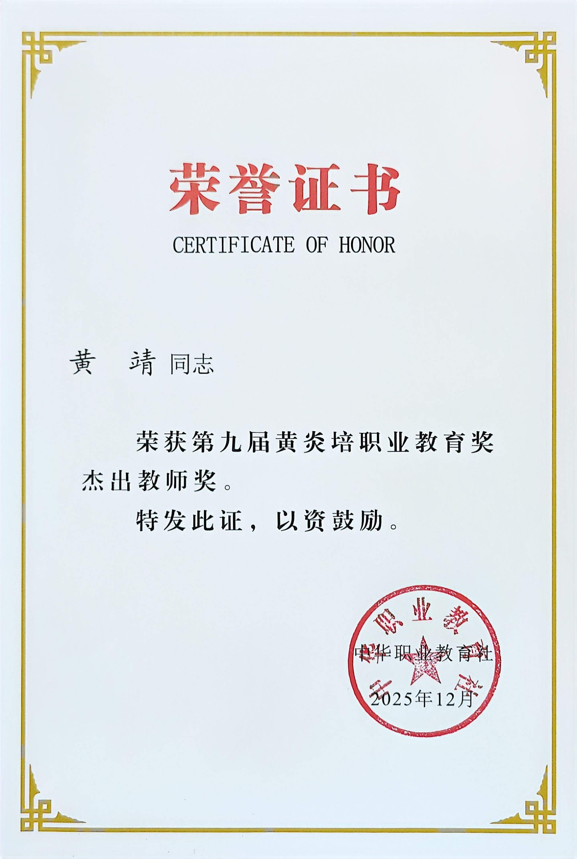 近日,第九届黄炎培职业教育奖颁奖仪式在北京隆重举行。我校国家级职业教育教师创新团队负责人黄靖教授凭借在职业教育领域的长期深耕与突出贡献,荣获“杰出教师奖”。