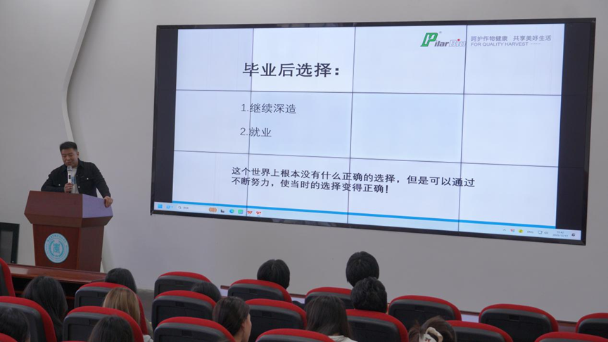 黄大成校友则以“农化植保行业介绍”为主题,向大家介绍农化市场现状及未来发展趋势,并结合自身从基层销售成长为省级区域负责人的奋斗历程,生动诠释了“规划创造未来、努力兑现选择”的职业精神。他特别指出,农资行业是保障粮食安全、支撑农业现代化的关键环节,鼓励同学们树立行业自信,积极投身农业相关领域,在实干笃行中实现人生价值。