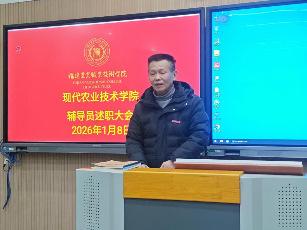 1月8日下午,现代农业技术学院在教(2)305教室召开2025年度辅导员述职会议。学院党总支书记欧高政、院长陈文胜、副院长冯冬林、党总支委员程晓琳及学生工作部学生管理科科长钟荣树参加会议。会议全面总结了过去一年学生工作取得的成效,深入交流辅导员队伍建设经验,研究探讨工作中存在的短板与对策,进一步推动学生工作提质增效和辅导员职业能力持续提升。