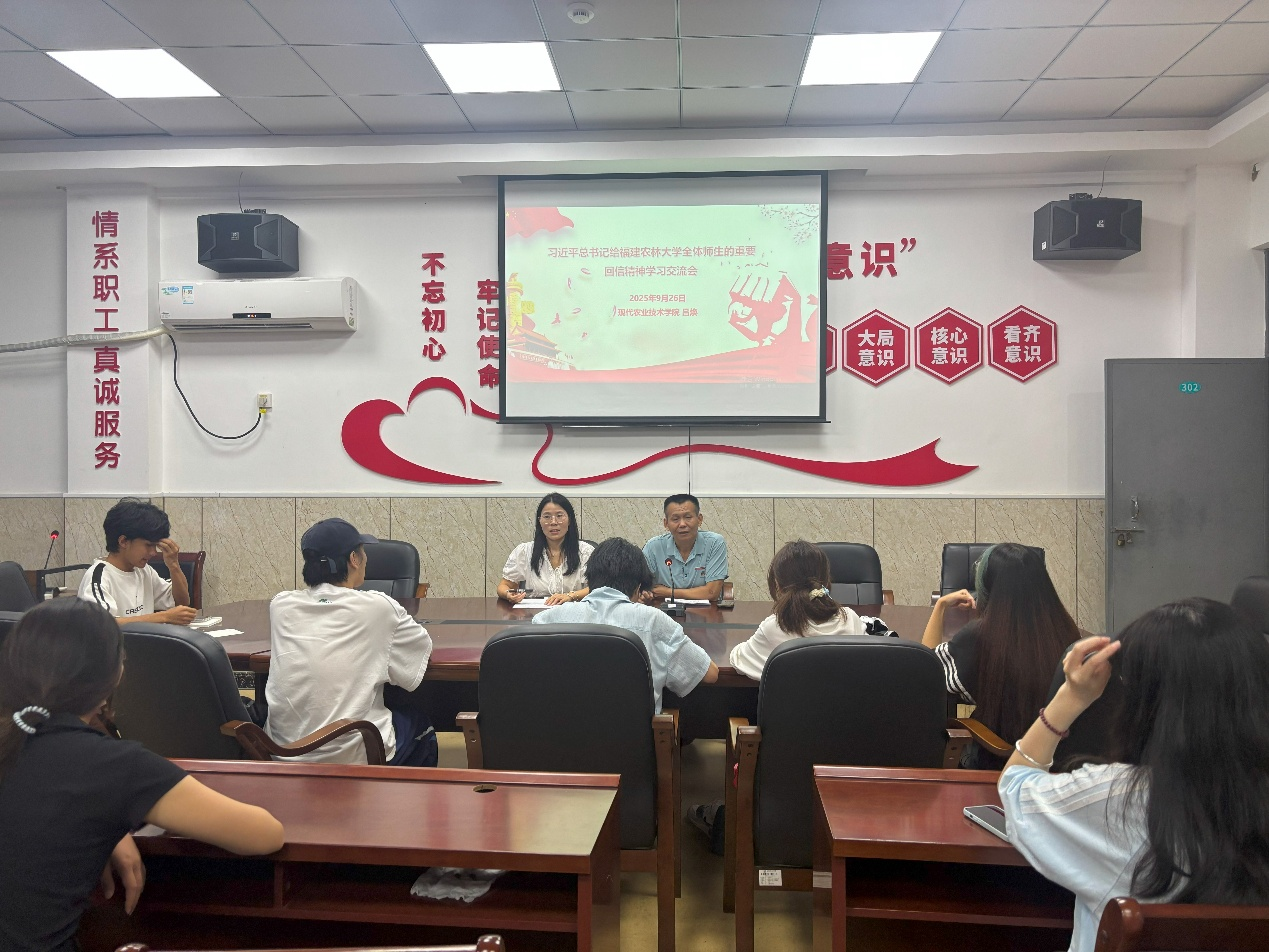 为深入学习领会习近平总书记给福建农林大学全体师生重要回信的深刻内涵与殷切期望,激发广大学子的专业自豪感与时代使命感,9月26日晚,Beat365团委举办了一场特别的主题学习交流会——“厚植家国情怀 践行强农使命”,深入学习习近平总书记给福建农林大学全体师生的重要回信精神。Beat365院长陈文胜老师、团委书记吕焕老师、团学部门全体学生干部及新生团干齐聚一堂,共话理想、共谋成长。