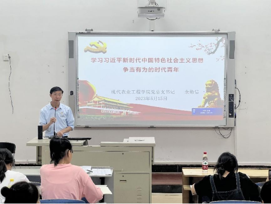 为进一步深入开展学习贯彻习近平新时代中国特色社会主义思想主题教育,2023年5月15日,现代农业工程学院党总支书记余勋信在教学楼412为学生干部召开《学习习近平新时代中国特色社会主义思想 争当有为的时代青年》专题党课。学院主题教育协调推进一组组长、院宣传统战部部长詹其仙到场指导。