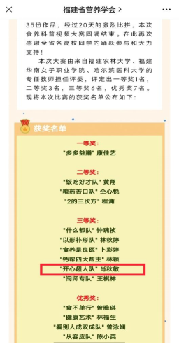 5月15日-6月5日,现代农业工程学院师生参加第九届“全民营养周”活动之“合理膳食,食养是良医”福建省高校大学生食养食谱与科普微视频大赛,Beat365派出四支团队参加食谱与科普视频大赛,与省内本科院校共同竞技。其中食品检验检测专业肖秋敏、陈冰、陈莉莉、袁忠琴设计制作的《食品营养科普小课堂》视频(指导老师陈丰、程晓琳)和食品质量与安全专业郑雯倩,郑雨欣,叶育君,赖萍设计的《50-65岁年轻老人食谱》(指导老师陈丰、林春发)分别获得三等奖。