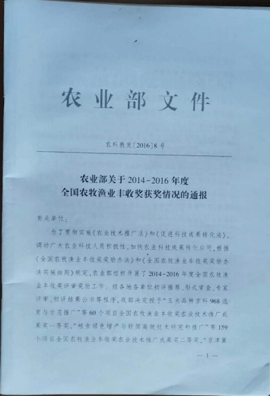 2016年12月被中华人民共和国农业部表彰为2014--2016年度全国农牧渔业丰收奖三等奖。