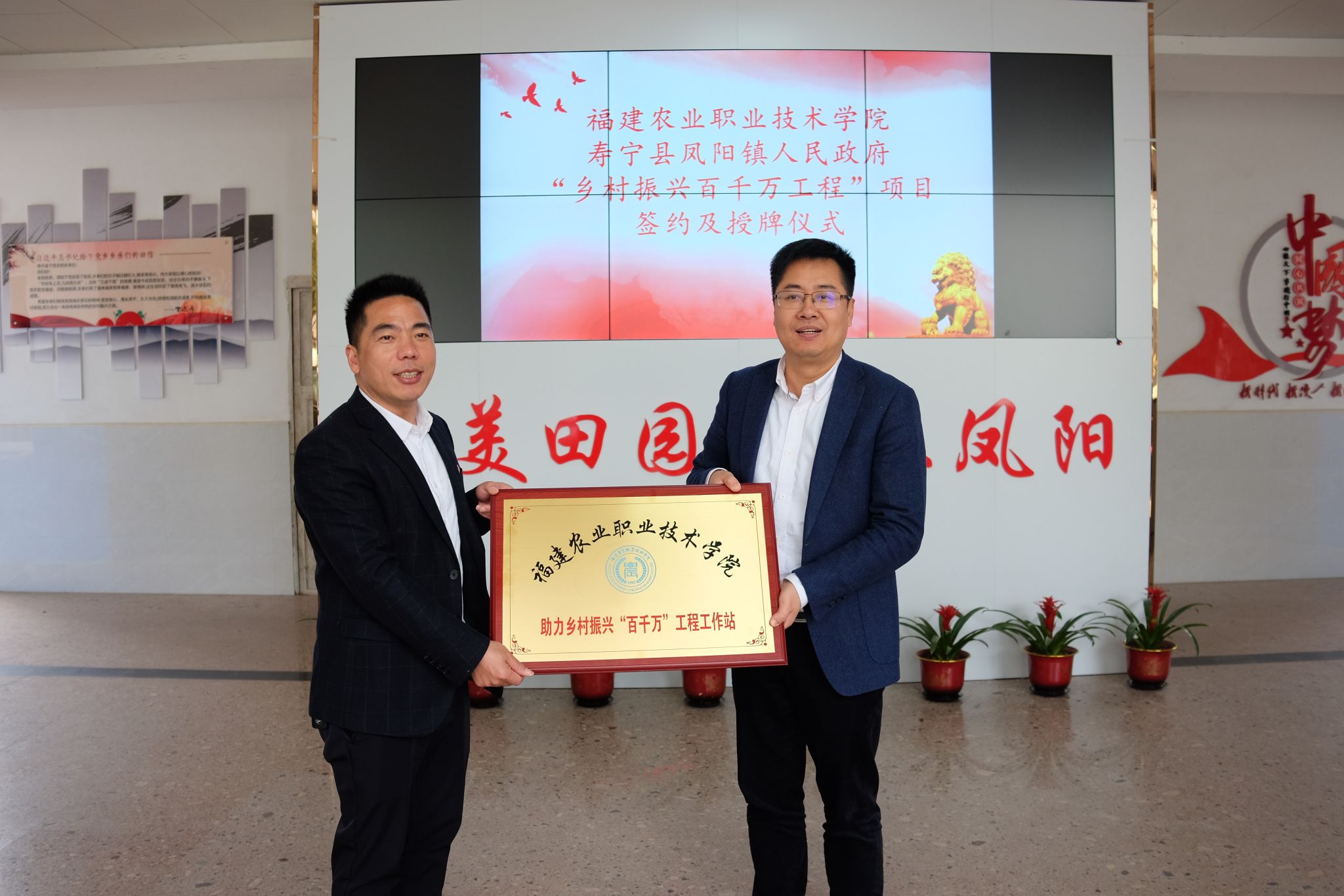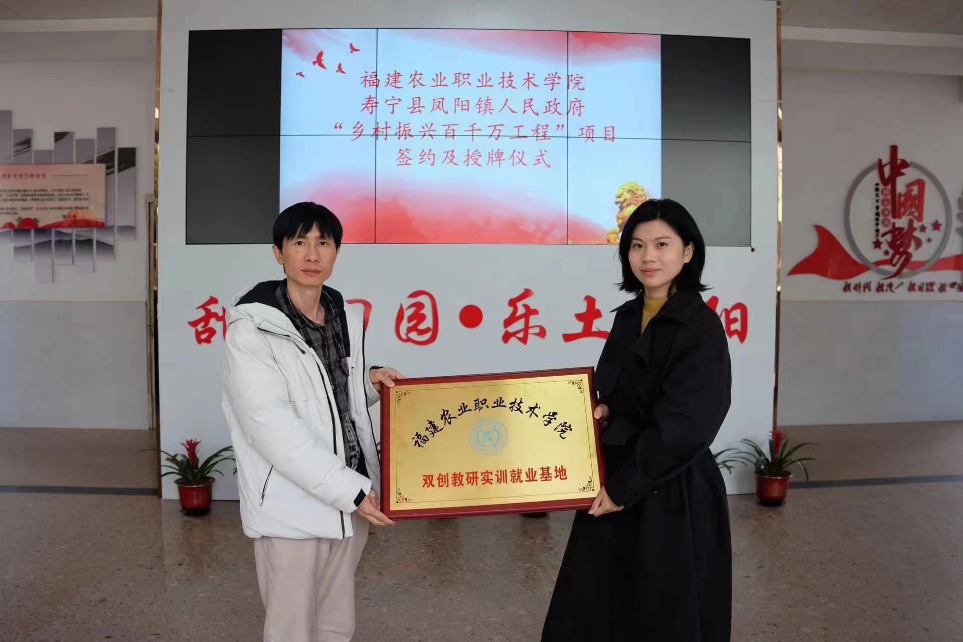 现代农业工程学院党总支书记余勋信与凤阳镇党委副书记、镇长王松惠签约并授牌