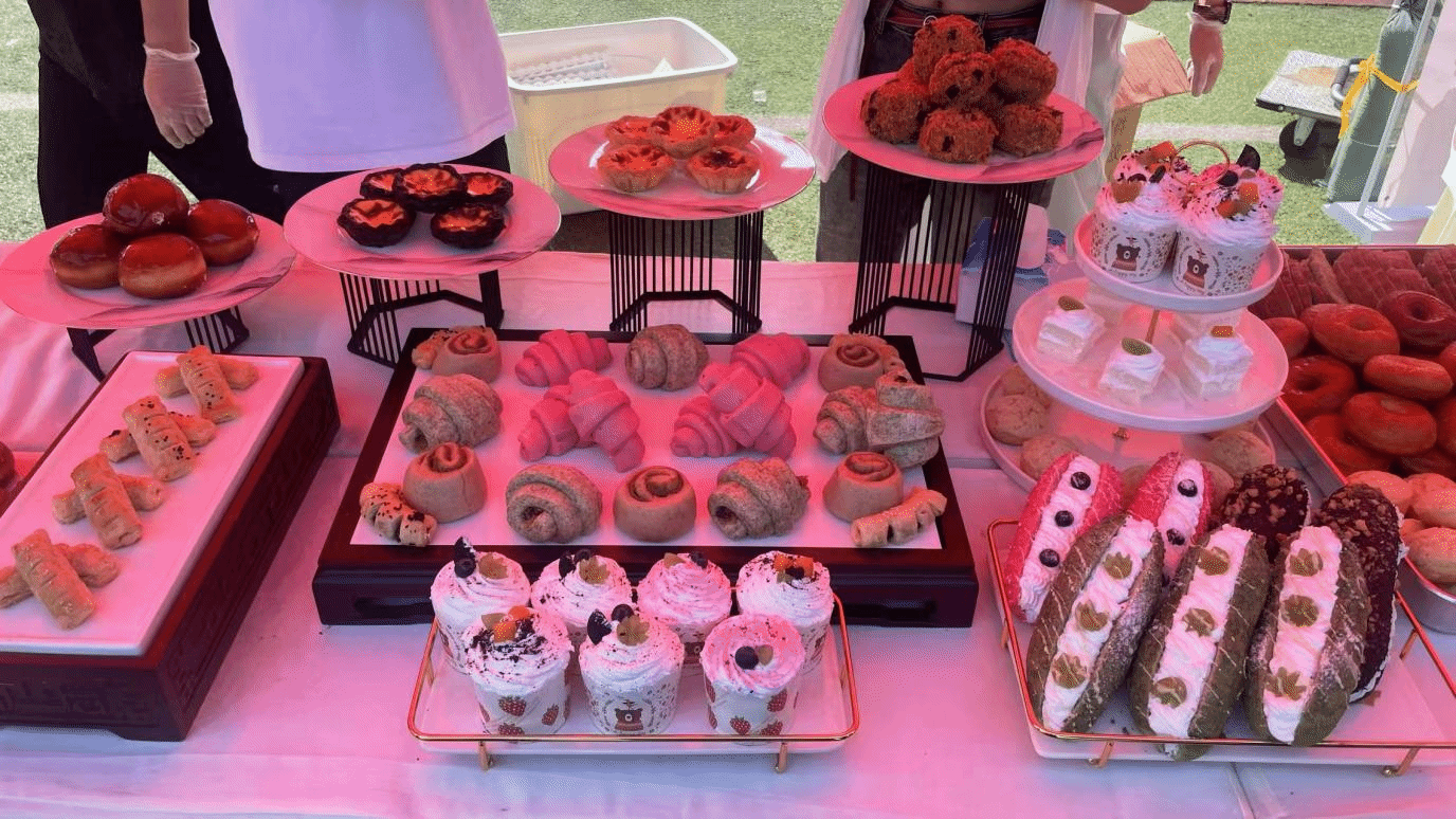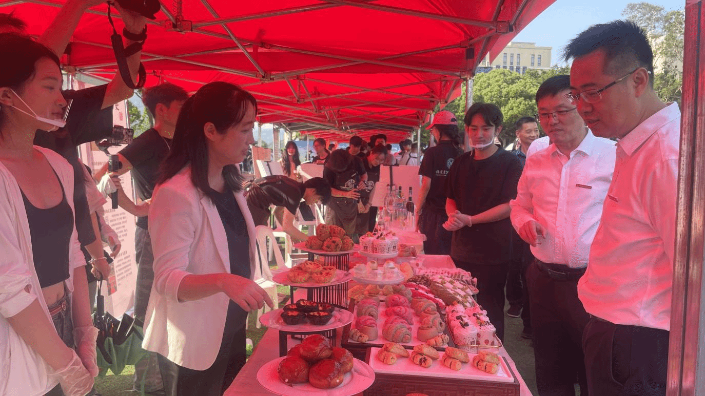 “西点筑梦,焙感幸福”现场,师生团队精心制作16种中西式糕点,无论是外观还是口感都令人赞叹。碧珀绯玉软欧,以独特的造型和丰富的口感,仿佛诉说着烘焙艺术的奇妙;翠影龙井米香包,将传统茶香与面点完美融合,散发着清新雅致的气息;幻彩魔纹法棍棒,以绚丽的色彩和独特的纹路,展现出创作者的奇思妙想;琥珀千层丹麦卷、金松雪绒小贝、雪域白钻蛋糕方等作品也各具特色,造型精美、风味独特,吸引了众多师生驻足欣赏与品尝。
