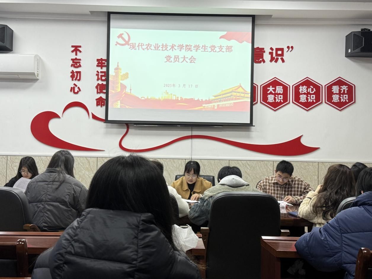 2025年3月17日,现代农业技术学院学生党支部于教学2号楼302会议室召开全体党员大会。会议由学生党支部书记翁佩莹主持。