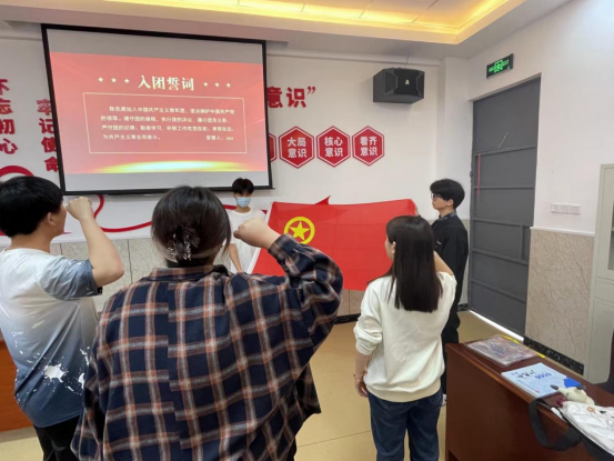 接着,团总支书记胡彩艳老师为新团员颁发团员证并佩戴团徽,带领新团员进行宣誓。戴上团徽的青年团员们拳头紧握、目光如炬,面对团旗庄严宣誓:“我志愿加入中国共产主义青年团,坚决拥护中国共产党的领导,遵守团的章程...为共产主义事业而奋斗。”新团员们用坚定的誓言表达着成为一名共青团员的责任和担当。青春誓言高昂,表达了同学们对共青团组织的无限向往和为团组织增光添彩的激情!