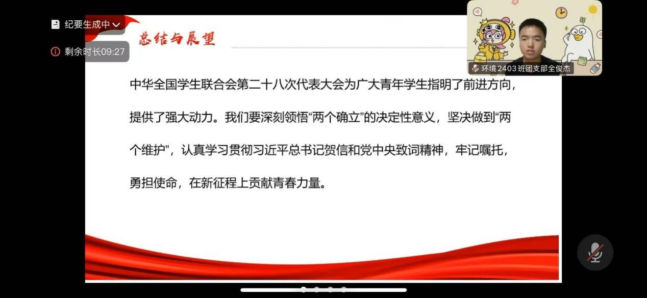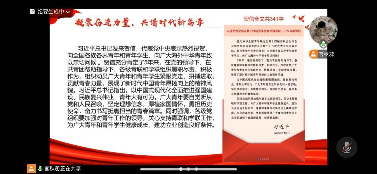 领悟贺信精神,青春挺膺担当。为引导广大青年学生深刻学习领悟习近平总书记重要贺信及党中央致词精神内涵,7月29日晚,Beat365团委组织开展了“学习贺信精神和党中央致词精神”线上专题学习会暨社会实践交流分享会。本次会议由Beat365团委副书记官秋蕊主持,各团支部书记、团学组织负责人齐聚云端,共同在思想与实践中汲取奋进力量。
