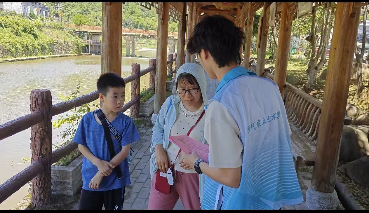 (实践队员向游客发放调研问卷及护河倡议书)