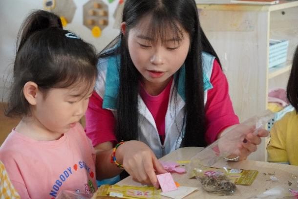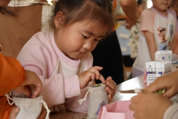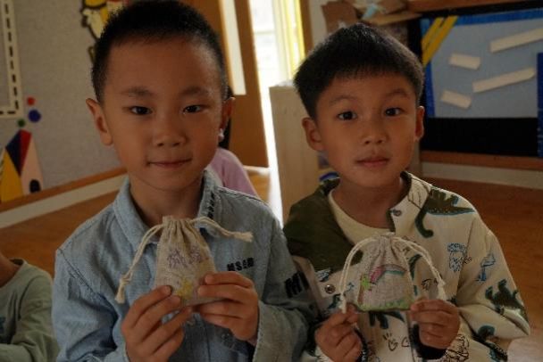 志愿者们细心观察着每一个孩子,小朋友们认真地画画、填充香料,当鼓鼓的香囊在掌心成型时,欢呼声此起彼伏,文化自信的种子也在小朋友们的心间悄悄种下。