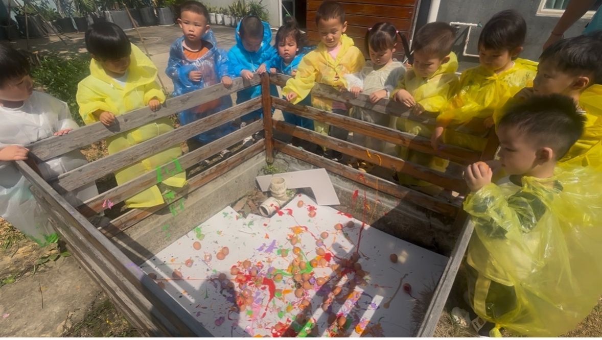 “稚造烟花蛋”中,孩子们将颜料蛋抛入池内,绽放彩色“烟花”。