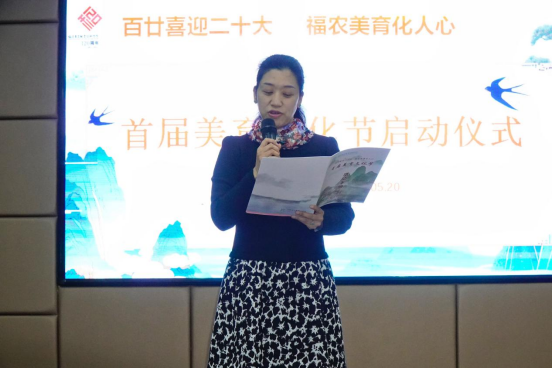 美育工作室负责人何斓老师首先介绍了本次美育文化节系列活动内容。美育文化节是我校为进一步落实立德树人教育理念,营造校园美育文化艺术氛围,以喜迎二十大与百廿校庆为主题所举办的校园特色文化主题活动。活动历时一个月,包含诵读展演、摄影展、知识问答、美食文化节、五禽戏表演赛、美学讲座、艺术沙龙等。