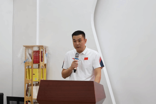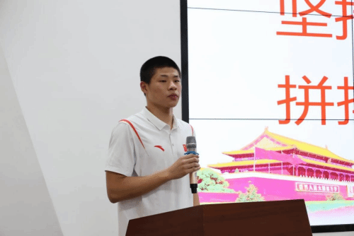 教练员张晓峰上台讲话。他感谢了学院对省游泳跳水运动管理中心圆满完成驻训任务提供的支持与保障,并分享了自己在带领队员训练和比赛中的经验和心得。
