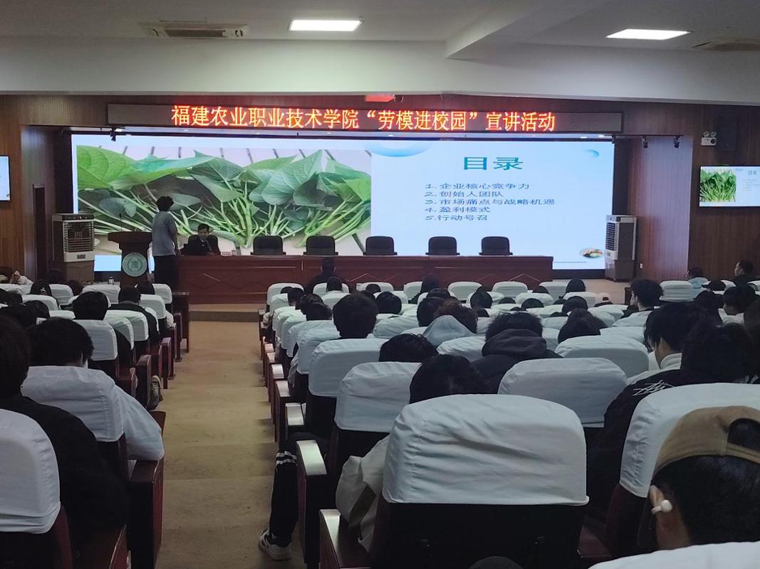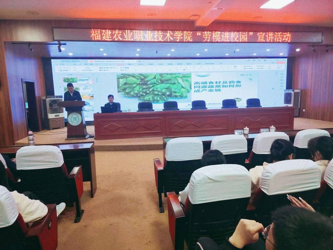 2025年12月3日,“劳模进校园”专题讲座在我校闽台楼学术报告厅举行。福建省劳动模范、厦门绿为先生物工程有限公司董事长钟俊杰应邀主讲,与公共教学部教师、现代农业技术学院师生代表等200余人,围绕高端食材及药食同源蔬菜的产业链建设进行交流。