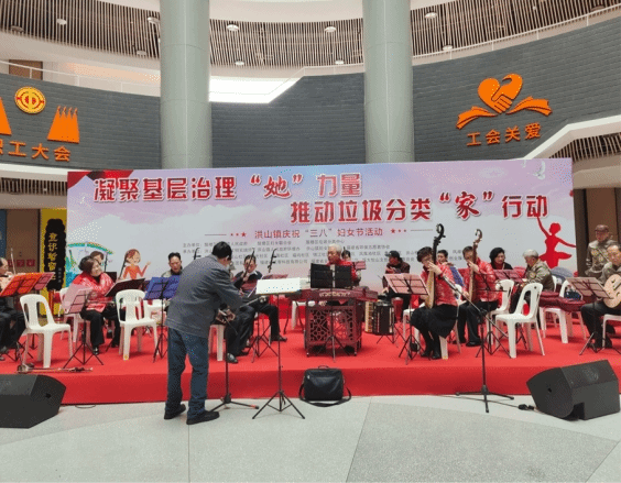 3月6日上午9:30-10:00,参与人员入场,开始第一个项目暖场活动,暖场活动以古筝合奏为开头,以舞蹈《茶香丝韵》为结尾,中间加入了快板说唱和合唱,开场的表演让现场气氛开始活跃。10:00-10:30开始了第二个项目启动仪式,由洪山镇领导致辞,然后为洪山镇的十位环保女工送去温暖礼品,为洪山镇12户绿色家庭代表颁奖,然后由巾帼环保志愿者代表宣读倡议书,最后由洪山镇妇女联合会送出祝福。第三个项目则是二手集市,活动现场设置了24个二手市集摊位点,大家用以物换物的方式进行交换闲置物品,现场还做了一些互动让更多人了解到垃圾分类的好处以及如何垃圾分类。