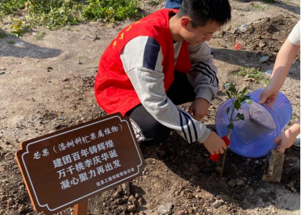 我校信息工程学院在校师生共同参与了此次植树活动,现场气氛热情高涨,师生分组配合,有的挥锹,有的培土,有的夯实,谨遵小组长种植前讲解的种植要领,齐心协力栽种下一株株充满生机和希望的树苗,并在建校一百二十周年来临之际,给树苗系上自己对母校的祝福。大家看到那一片自己亲手种下的树苗在微风中摇曳,无一不露出幸福的笑容。