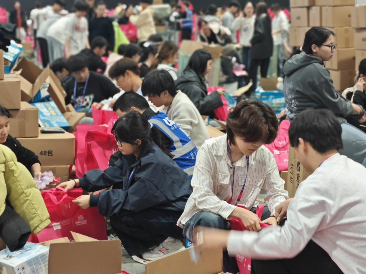 12月13日清晨,志愿者们准时到达各自的岗位。大家分工明确、配合默契,有条不紊地将各类物品装入完赛包中。共计完成35000余份完赛物资的打包工作,每一份完赛包都承载着志愿者们的心血与祝福。