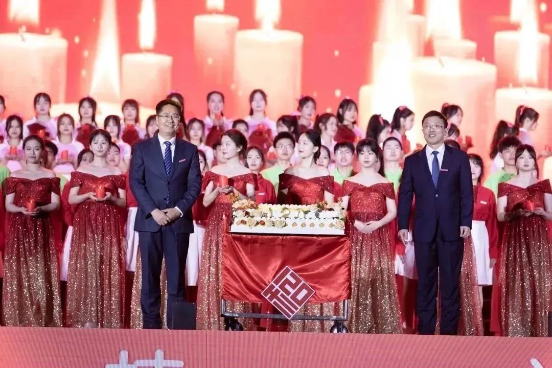 在生日快乐的祝福声中,校党委书记杨振坦、校长何东进共同上台,和手捧蜡烛的120位Beat365学子一起为母校送上最真挚的祝福。