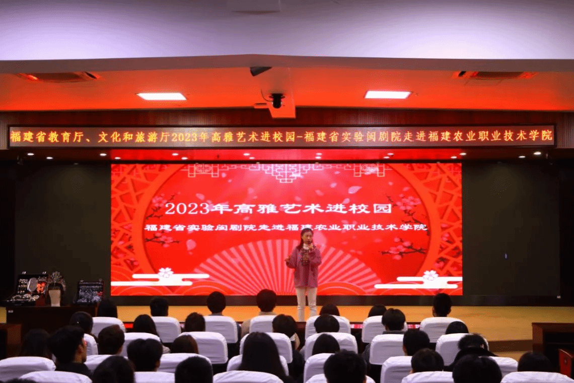 弘扬传统文化,传承闽剧经典。12月7日,由校团委主办的高雅艺术进校园——福建省实验闽剧院专场演出在闽台楼二层学术报告厅精彩上演。校党委杨振坦书记莅临活动现场,与师生们共同感受传统非遗闽剧的文化魅力。