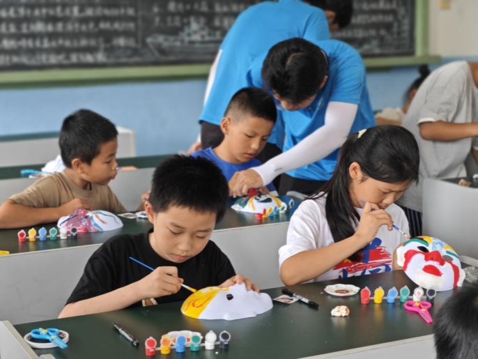 (小朋友们在课堂上展示脸谱绘制的成果)
