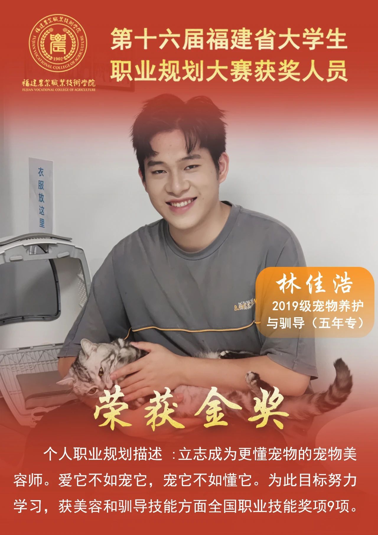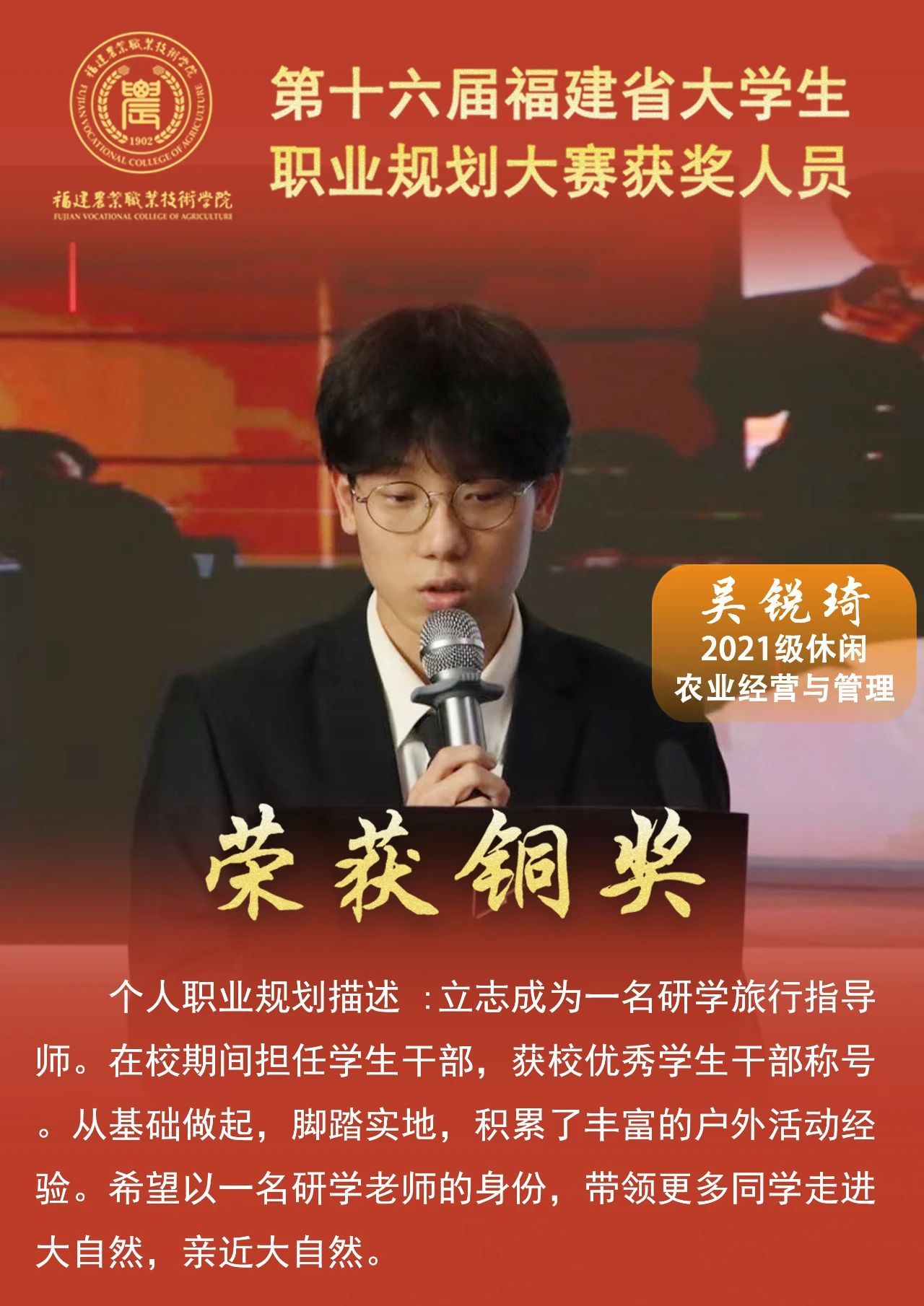 日前,福建省教育厅印发《关于公布第十六届福建省大学生职业规划大赛获奖名单的通知》,我校师生在本届大赛中获得1金2银3铜的优异成绩。其中,金奖项目选手林佳浩同学推送参加国赛,实现在该赛事上重大突破。同时,学校荣获优秀组织奖,优秀指导老师2名。