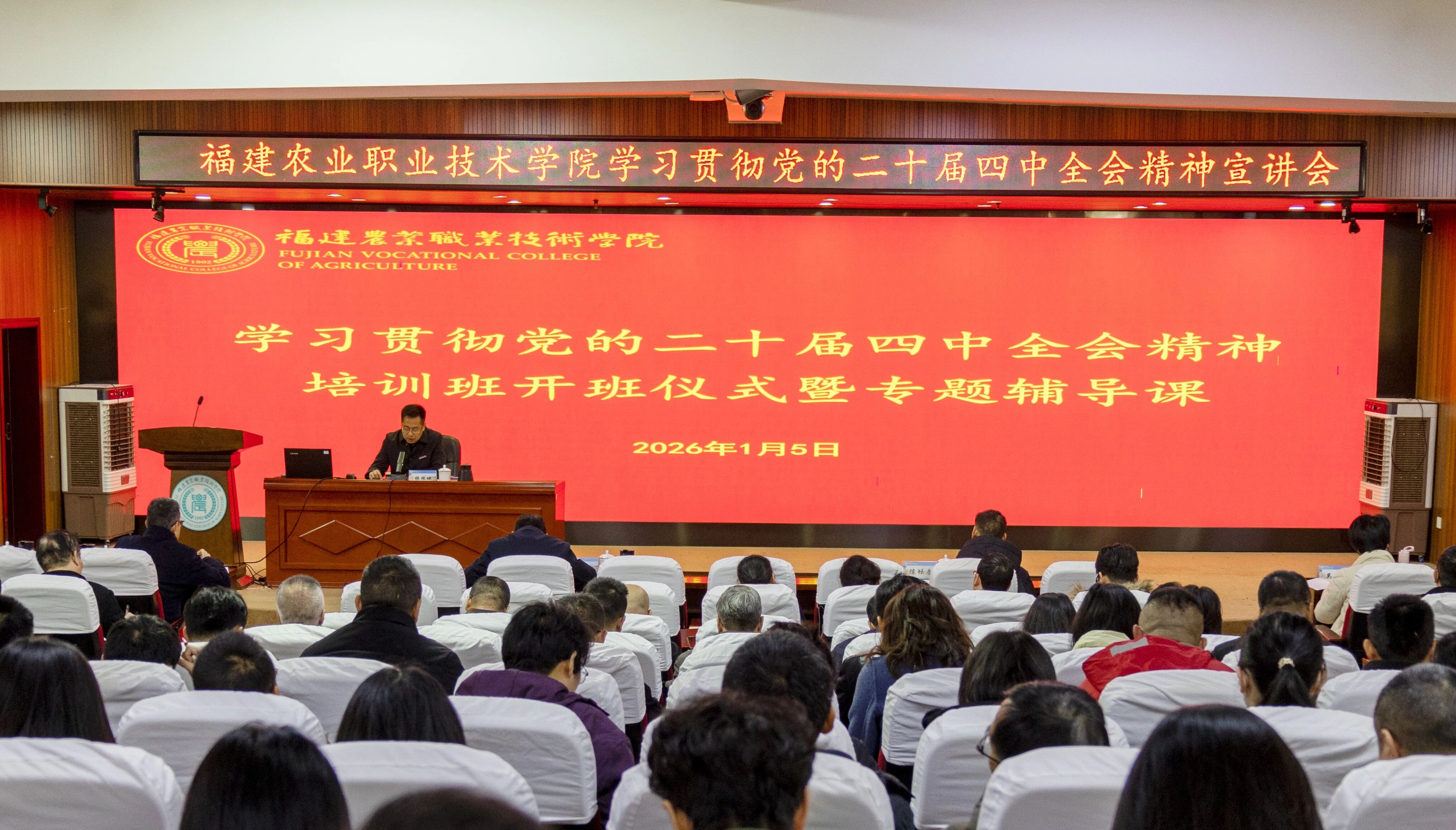 为深入学习领会、全面准确把握党的二十届四中全会精神的丰富内涵和核心要义,切实把全校师生的思想和行动统一到党中央的决策部署上来,2026年1月5日上午,学院学习贯彻党的二十届四中全会精神专题培训班在闽台楼学术报告厅举行。学院党委书记杨振坦出席并作开班动员讲话,学院领导班子成员、中专部领导班子、学院副科级以上干部、马克思主义学院专任教师及优秀年轻干部培养人选等160人参加。培训班由党委副书记王振亮主持。开班式上,...