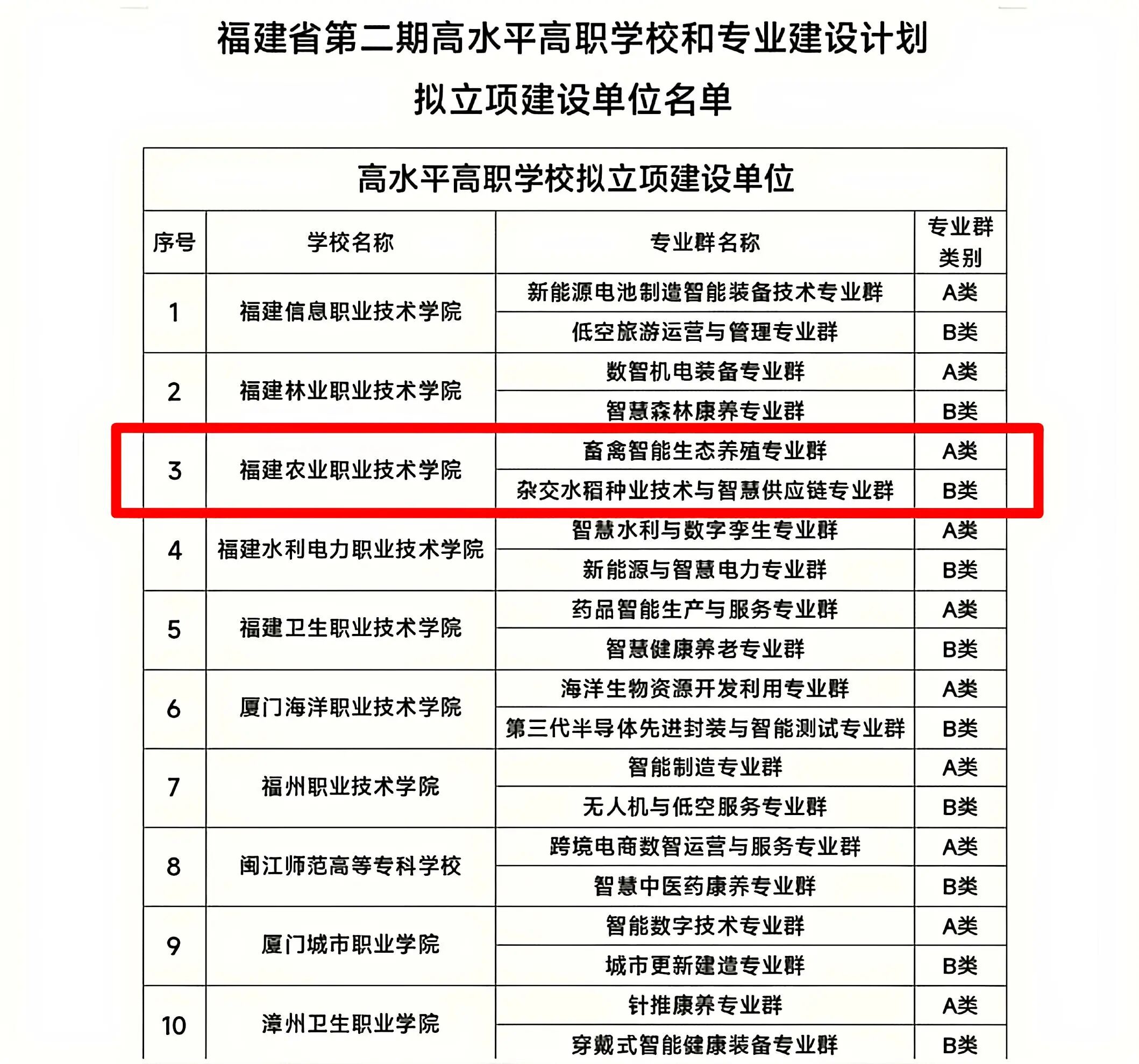 岁启新章,捷报传来。2026年伊始,省教育厅公示了“福建省第二期高水平高职学校和专业建设计划拟立项建设单位名单”,我校被确定为“福建省高水平高职学校拟立项建设单位”,畜禽智能生态养殖专业群(A类)、杂交水稻种业技术与智慧供应链专业群(B类)两个专业群入选。作为福建省唯一的农业类高职院校,再度跻身福建省“双高计划”建设方阵,开启了学校高质量发展新的里程碑。“十四五”以来,我校主动对接服务“教育强国、农业强国、...